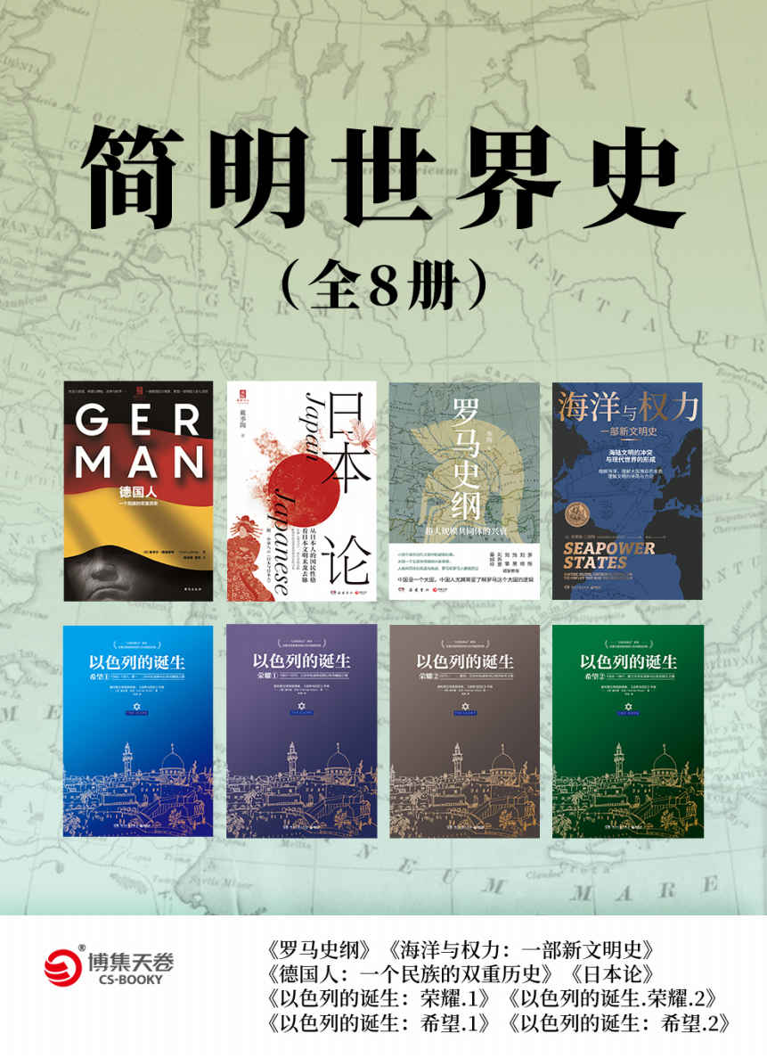 套装共8册,分别为《罗马史纲》《海洋与权力:一部新文明史》《德国人:一个民族的双重历史》《日本论》《以色列的诞生》系列。介绍了罗马、德国、日本、以色列及海洋国家的文明史。