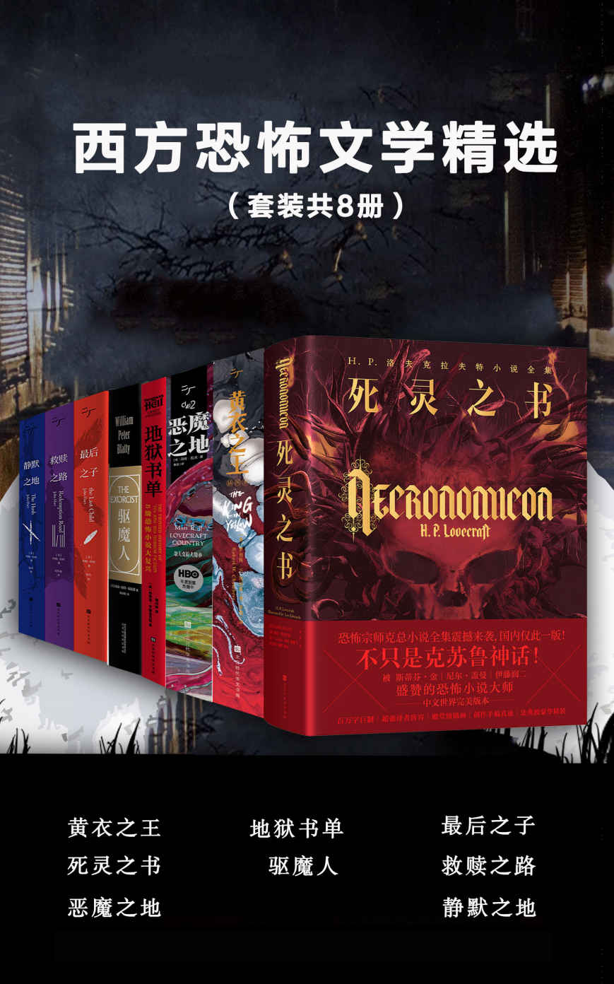 套装包含图书: 《黄衣之王》《死灵之书》《恶魔之地》:1本包含克苏鲁神话的洛氏小说全集,1本前洛氏恐怖文学作品,1本新世纪克苏鲁神话小说。 《地狱书单》《驱魔人》:1本介绍7080年代恐怖文学的大书单,1本70年代经典恐怖电影的原著小说。 《最后之子》《救赎之路》《静默之地》:美国推理界最高奖“爱伦·坡最佳小说奖”的当代双冠作家经典惊悚作品。