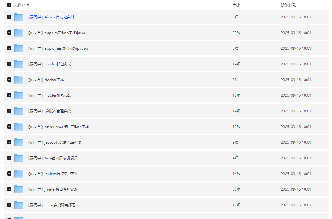 【码同学】全栈测试开发实战课程覆盖了当今热门的全方向全栈测试开发技术,涵盖了自动化测试、性能测试、安全测试、持续集成与持续交付等方面。通过本课程,学员将深入了解并实践最新的测试开发工具与方法,提升技术能力,并为未来职业发展打下坚实基础。课程以实践为主,结合真实项目案例,让学员在实战中掌握全栈测试开发的核心技术。