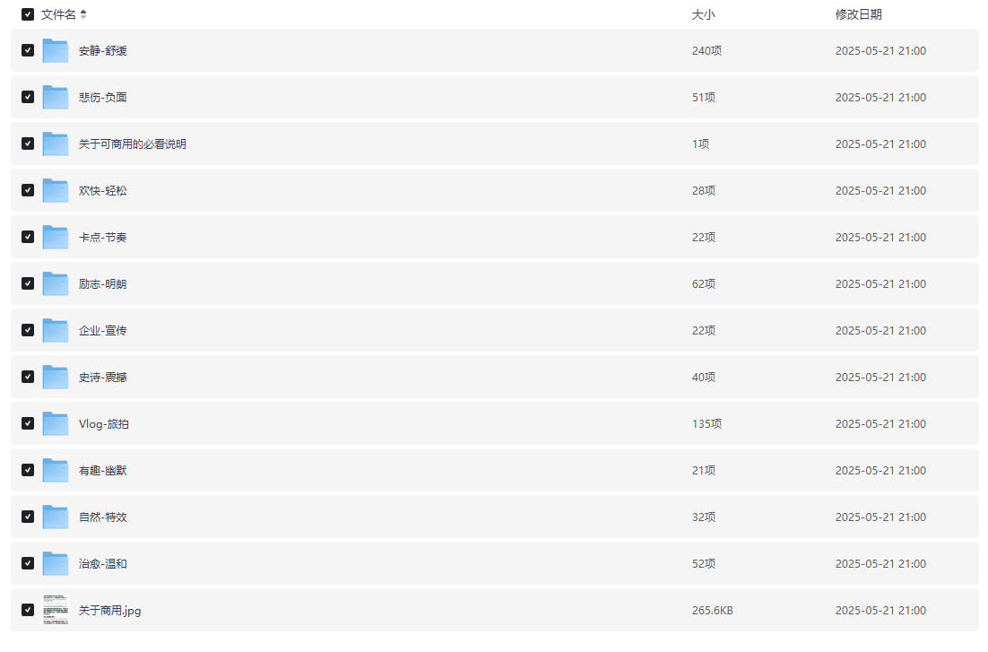 800+首顶级可商用音效BGM素材合集!全中文分类,精选素材,夸克网盘课程。这份资源包汇集了超过800首经过严格筛选、可用于商业项目的背景音乐和音效,所有内容均按中文标签进行分类,帮助创作者在不同场景中迅速找到所需素材。每一类都对应特定的使用场景与情感氛围,从旅拍Vlog到企业宣传,从励志激昂到自然特效,无需担心版权问题,即可直接应用于视频、广告或多媒体项目中。