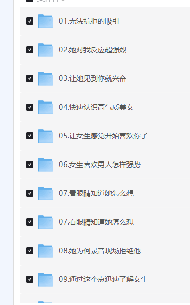成真《偷听女人心45期》,夸克网盘课程。成真《偷听女人心》第45期汇集了多种切实可行的男性提升魅力、解码女性内心反应的策略。课程涵盖从初次见面如何制造吸引力,到长期关系中维持热度的技巧;从对话中洞察对方真实想法,到把握关键时机深化亲密。这里浓缩了45个专题要点,帮助男性在相亲、约会或日常社交中,更快速地与高气质女性建立联系,并让对方展现出好感和依赖感。