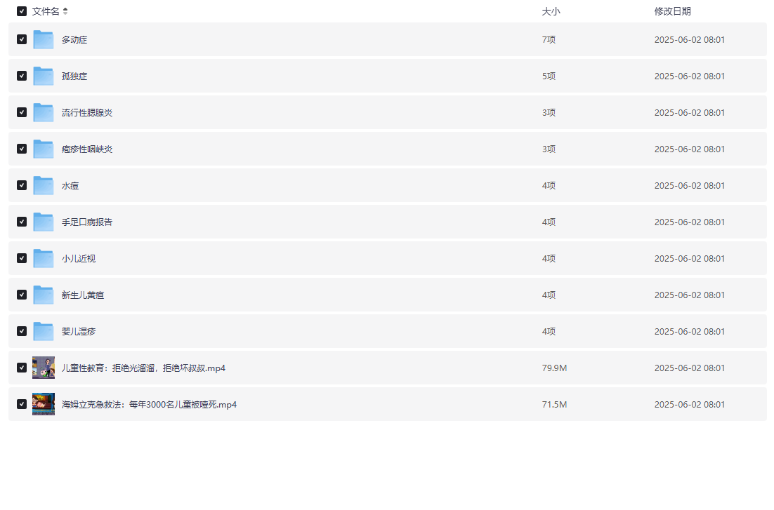 儿童疾病防治【1.85GB】,夸克网盘资源。汇集了多项与儿童健康密切相关的知识和视频。涵盖了儿童性教育(一部名为《儿童性教育:拒绝光溜溜,拒绝坏叔叔》的视频)、多动症、婴儿湿疹、孤独症、小儿近视、手足口病报告、新生儿黄疸以及水痘的基本概念与预防措施。其中还深入介绍了流行性胞腺炎这一容易被忽视的病毒感染情况,以及泡疹性咽峡炎这种常见的儿童口咽疾病。一部题为《海姆立克急救法:每年3000名儿童被暖死》的视频强调了误食异物时急救操作的重要性,为家长和老师提供了应对呼吸道梗阻的实用技巧。整套素材既包括针对具体疾病的症状、护理和预防建议,也有急救方法的演示,对关心儿童健康的家庭和教育工作者具有较高参考价值。