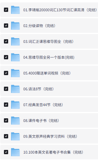 李靖瑜英语课程大合集,包含20000词汇课、分级读物资料、词汇思维导图、4000单词课、语法课、经典发音课、课件电子书、经典学习资料,还有100本英文原著电子书,非常棒的一套英语学习课程合集~
