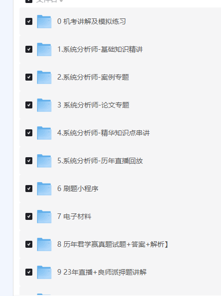 2024软考高级系统分析师VIP套餐课程,夸克网盘课程资源。软考高级系统分析师VIP套餐汇集了从基础到冲刺的全流程备考资源,为考生提供系统化学习与实战演练的双重支持。官方机考绘图指南由乐凯出版,帮助掌握核心题型的绘图标准;机考讲解与模拟练习覆盖真实考试场景,增强实战经验。基础知识精讲针对考试大纲,打牢学科根基;案例专题与论文专题分别提升分析能力和写作水平;精华知识点串讲则梳理高频考点,实现知识快速回顾。
