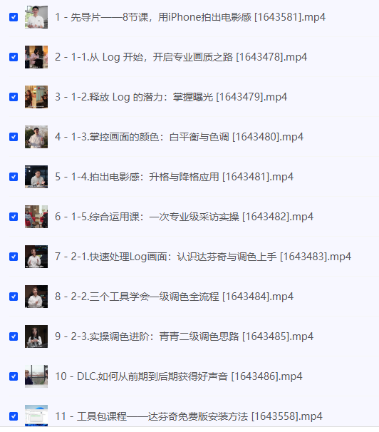 【影视飓风】只看8节课,用iPhone拍出电影感,夸克网盘课程。本系列课程由 8 节精炼视频组成,带学员用 iPhone 实现专业电影质感。课程从 Log 格式入手,讲解噪光处理、白平衡与色调控制、升格与降格运镜在影像氛围营造中的应用,促进画面表现力。综合运用环节以真实采访项目贯穿,帮助掌握拍摄全流程。调色部分以 DaVinci Resolve 免费版为平台,介绍安装方法、示波器使用、一级调色全流程与二级调色思路,并配合“青青”独家调色 LUT,让学员快速上手。工具包课程深入外录硬盘设置及 LUT 自制与导入,提供前后期预设文件包与专属 LUT,助力个人创作和商业项目高效输出。整个体系设计简洁直观,适合从零基础到进阶需求的短期速成。